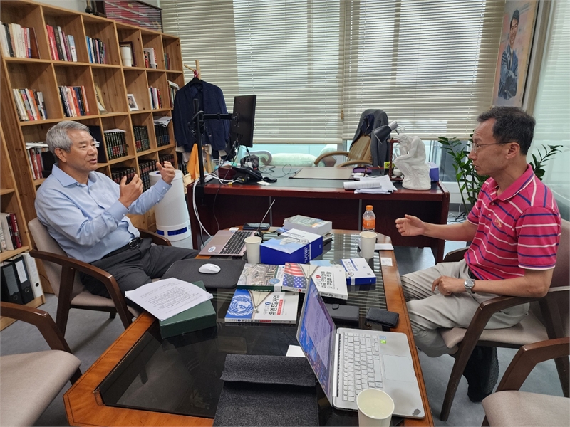 김만기 카이스트 방산수출전문가과정 책임교수(사진 왼쪽)와 박종국 뉴스임팩트 편집국장이 대화하고 있다.@뉴스임팩트